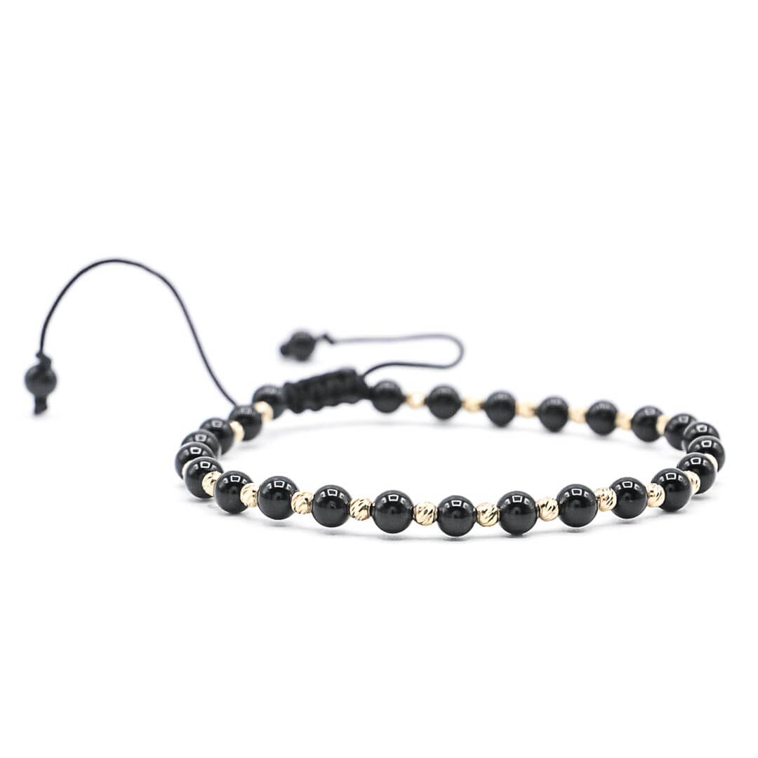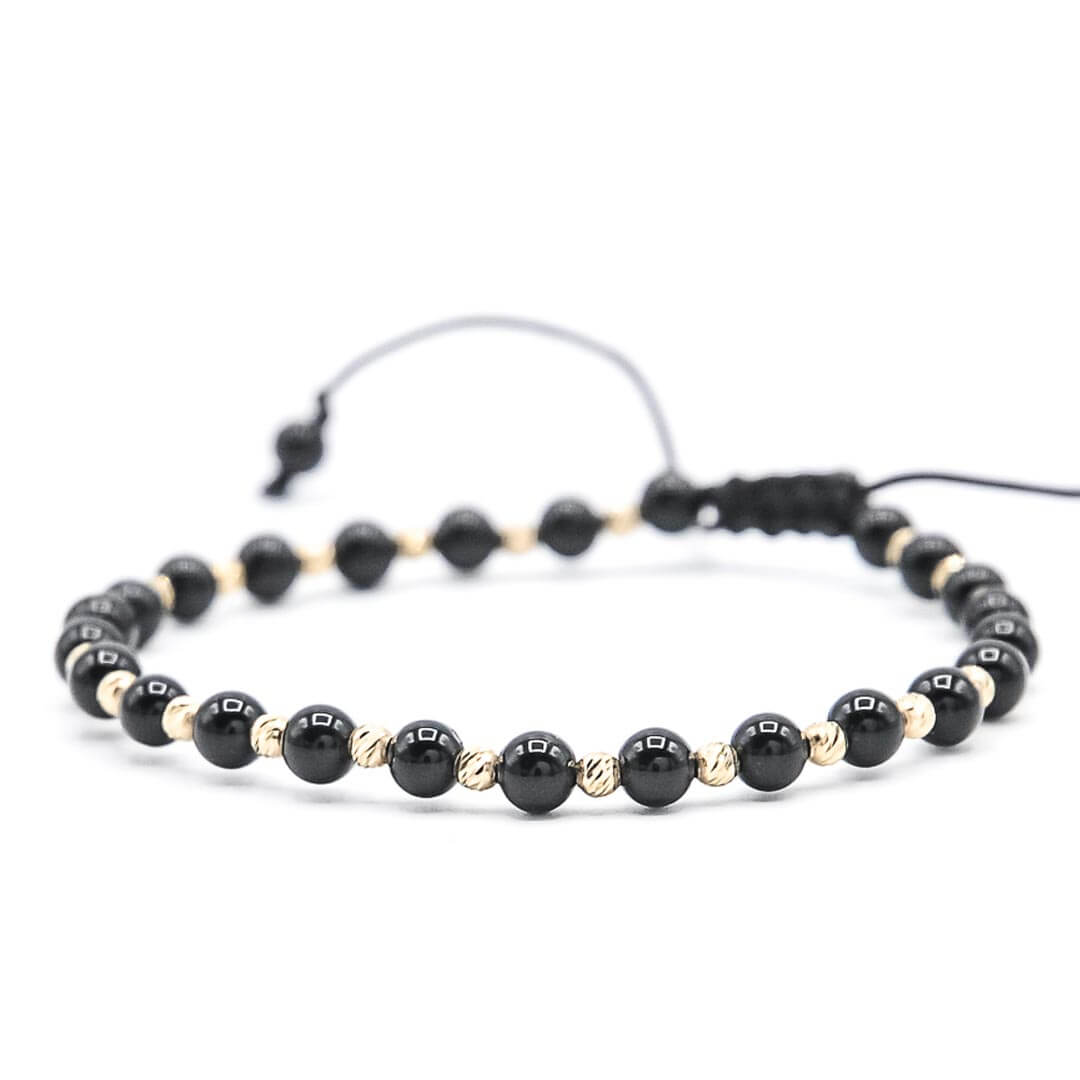 Bratara aur 14K cu snur negru reglabil, AR2698, cu bilute din aur 14K de 2,5 mm si bilute onix